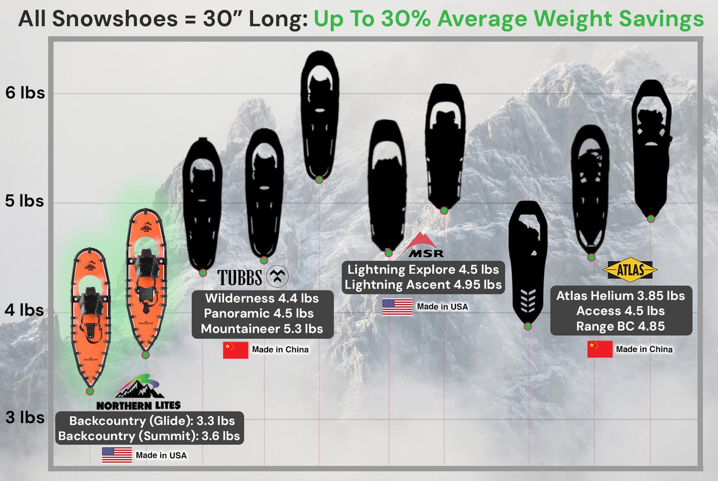 At just over 3 lbs. per PAIR, the 30" long Backcountry weighs less than the 22" models of other snowshoes!