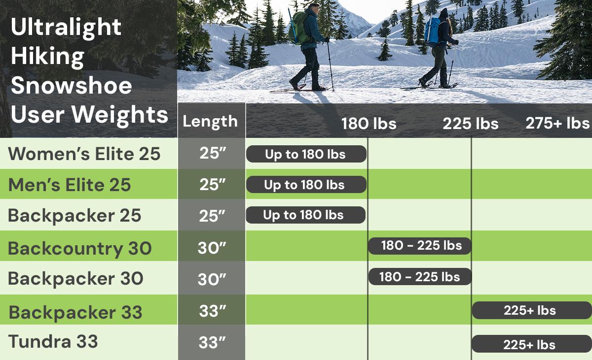 Designed for men and women up to 225lbs looking for a backcountry workhorse that won't leave you with sore legs, the Backcountry provides the floatation you'll need but with huge weight savings. Longer and slightly wider than the 25" Elite, the Backcountry gets the job done for heavier users or deeper snow conditions when you need to stay on top.