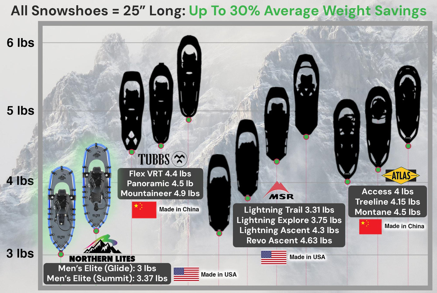 Starting at ~3 lbs. per PAIR, the Men's Elite is around half the weight of other men's 25 snowshoes!