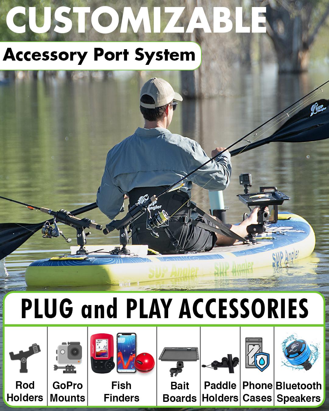 The included 3" cleat gives you a dedicated anchor tie-off point, while the dual accessory ports let you plug and play our full lineup of other paddle board fishing and exploring accessories — phone mounts, cup holders, fish finders, bait boards, Bluetooth speakers and more.